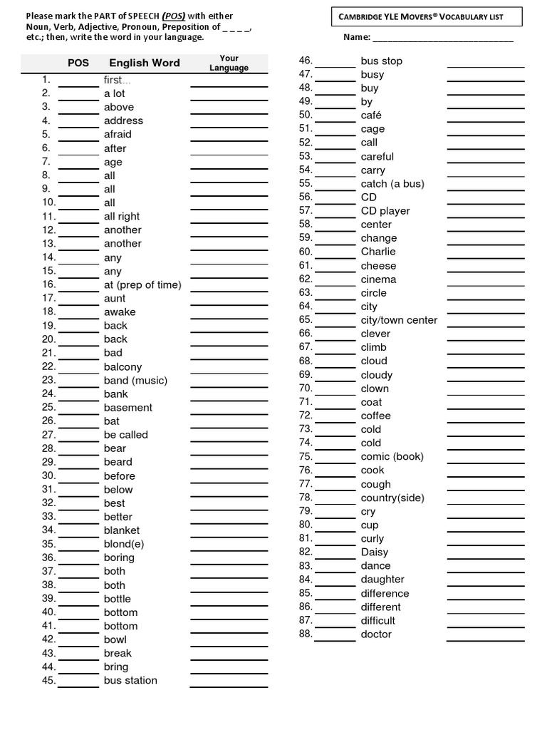 Movers Vocabulary Worksheet Pdf Pdf Part Of Speech Syntax
